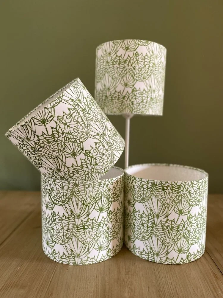 Liaise with me about the size and shape of the shade or cushion you’d like, then select one of my designs in a hand-mixed ink chosen by you.