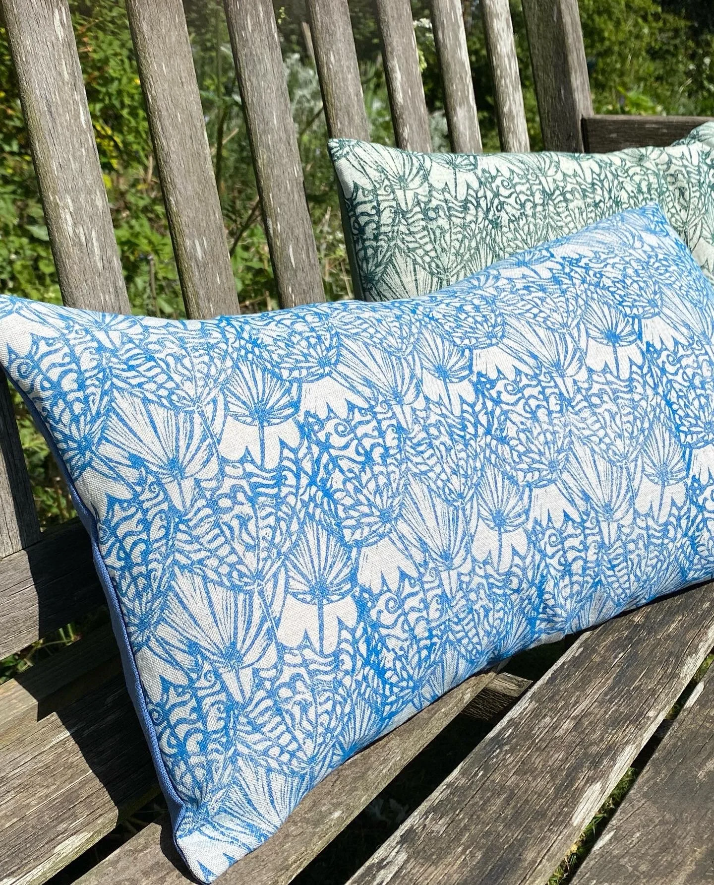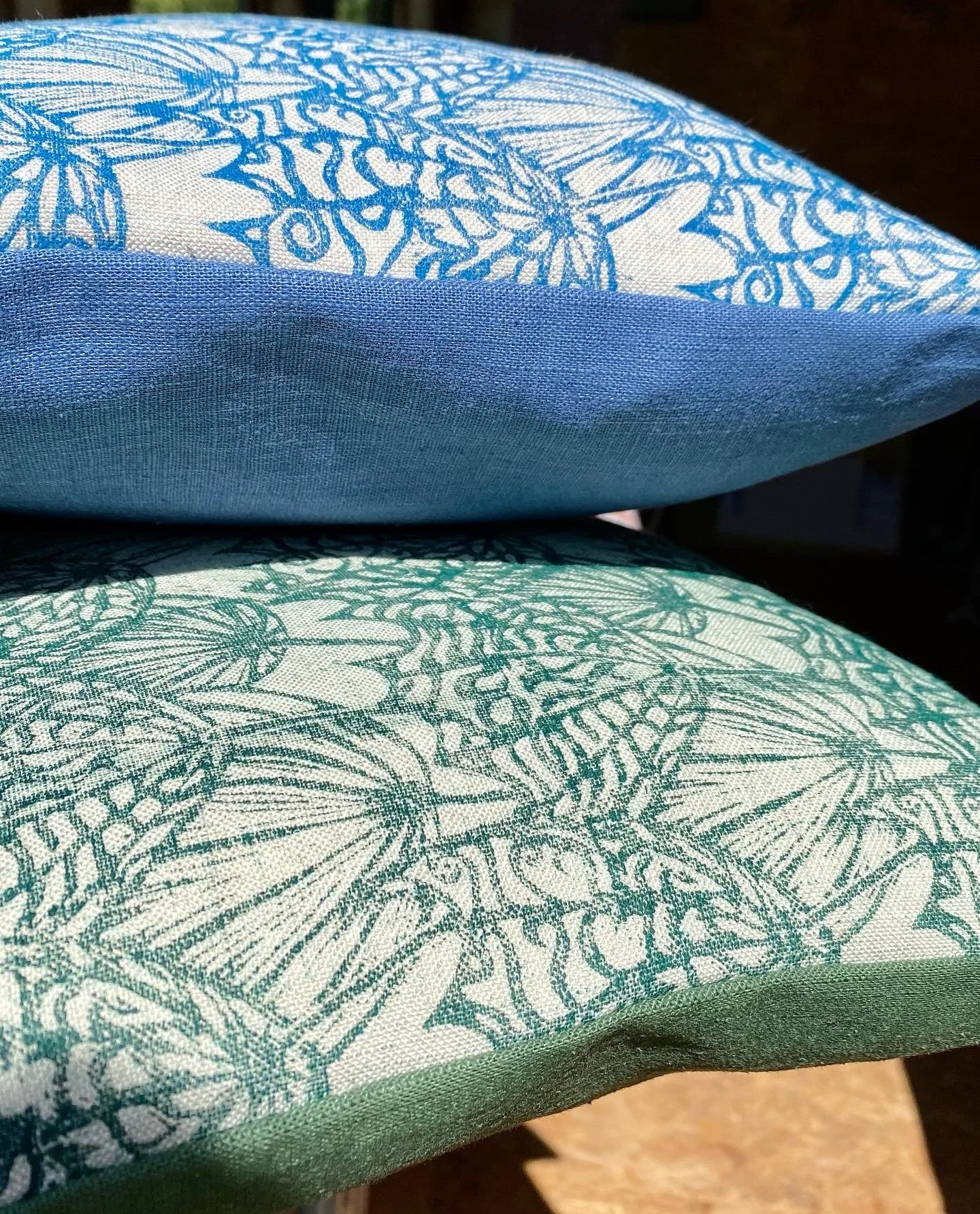 Jess handprints and sews all her cushions, meaning each piece is a one-off. She loves using quality linen to ensure the cushions are hard-wearing as well as luxurious. They are filled generously with a feather inner. Hypo-allegenic or vegan alternatives are also available. Let Jess know your preference when you place your order. She can also print new covers for your existing inners. Contact her to discuss bespoke orders.